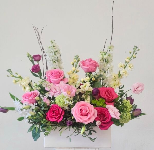 A beautifully curated design of seasonal garden style blooms.