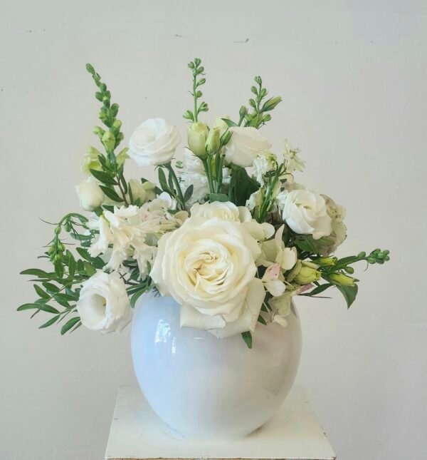 A round pearly pot holds lovely seasonal and imported all white blooms, designed all the way around in table top style.